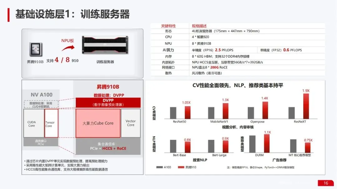 算力基础设施能力:提供基于鲲鹏CPU和昇腾NPU的训练服务器(4U机架,8昇腾910B,FP16算力2.5PFLOPS)和推理平台*(INT8算力140 TOPS),支持风冷/液冷,具备安全启动等企业级特性。这是其与传统云服务商竞争的核心优势之一。