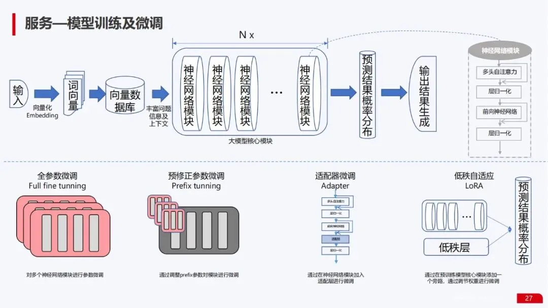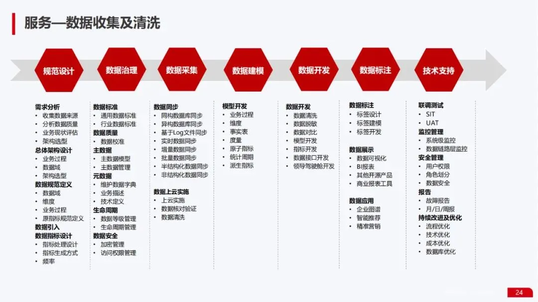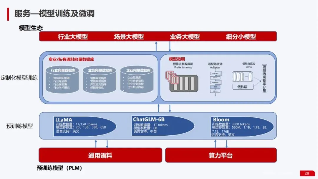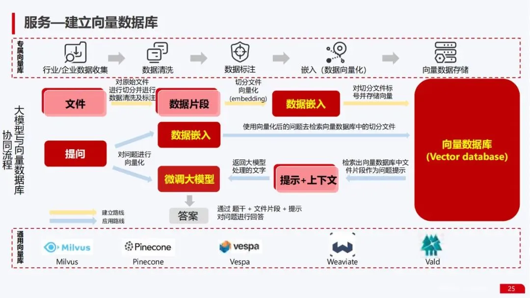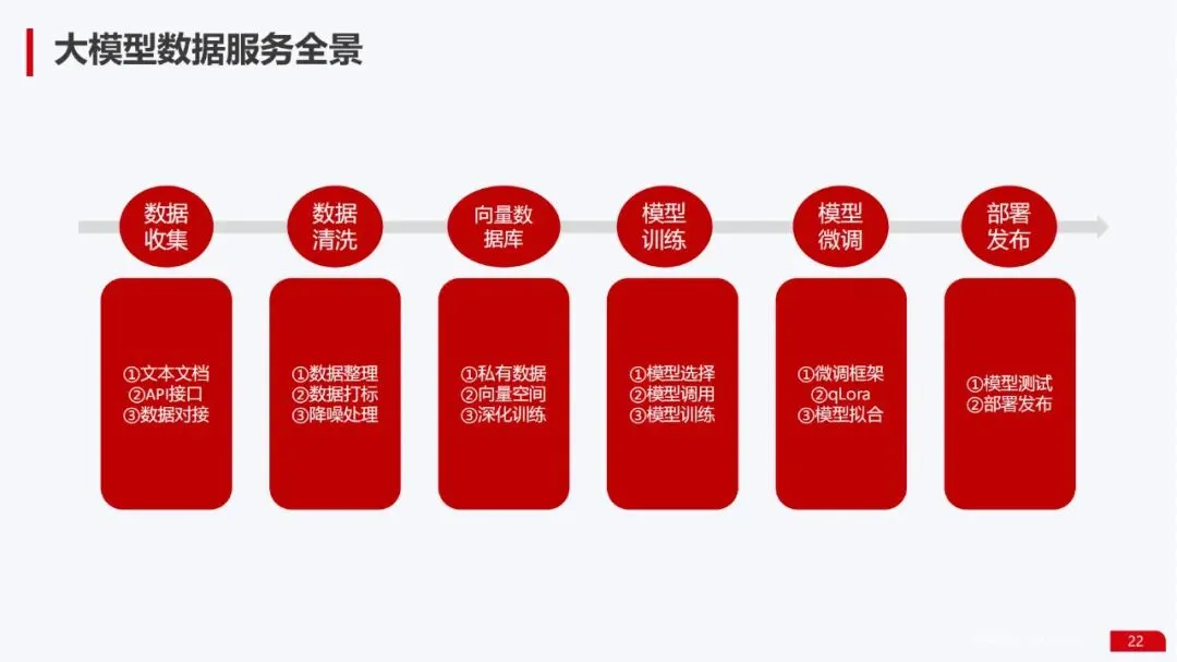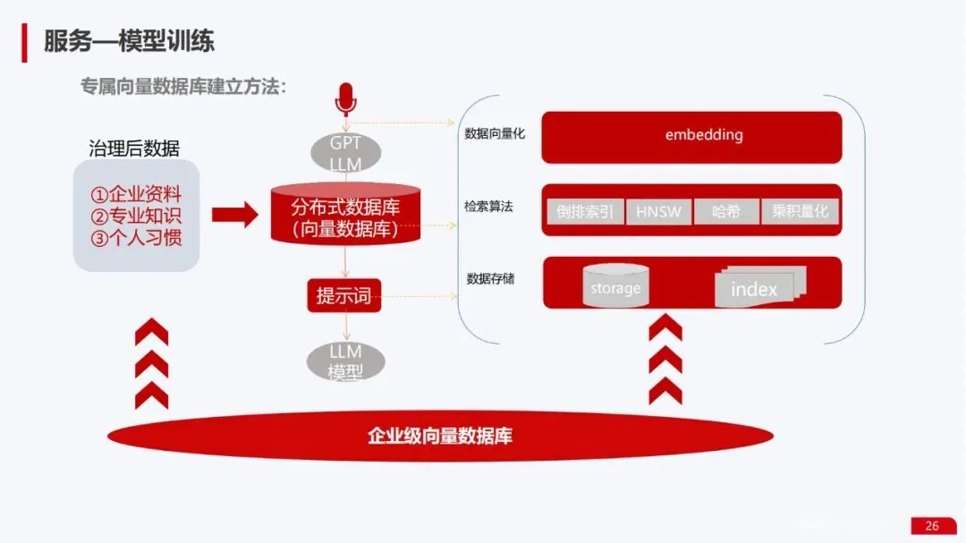 数据服务能力:提供了从数据收集、清洗、建立向量数据库,到模型训练、微调、部署的完整数据流水线全景图。特别强调了企业级向量数据库的构建方法,这是实现知识库增强和私有数据利用的关键。