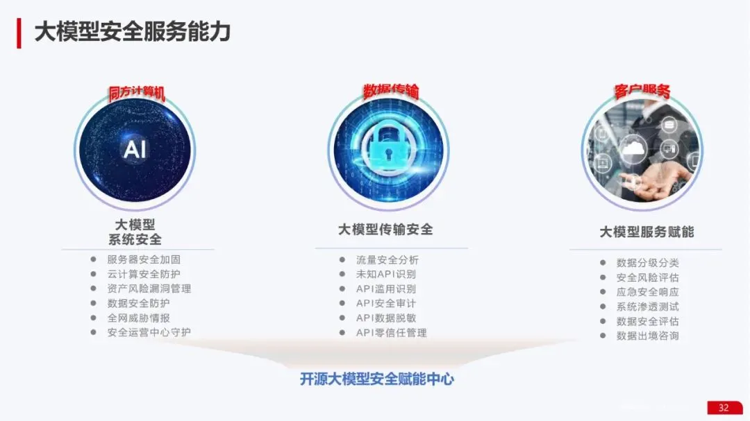 安全服务能力:构建了覆盖大模型系统安全(服务器加固、云安全防护)、传输安全(API安全审计、数据脱敏)和服务赋能(安全风险评估、渗透测试)的全方位安全保障体系。