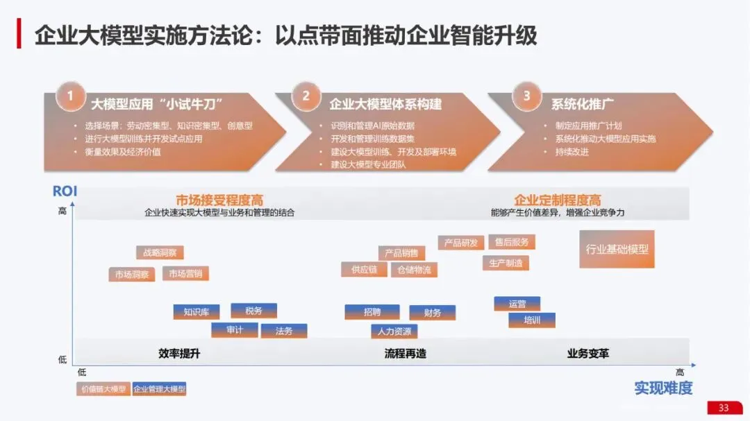 实施方法论:强调从战略驱动出发,通过顶层设计,选择高频、高价值场景作为切入点(“点”),成功后再横向扩展至其他业务领域(“面”),稳步推动企业智能升级。