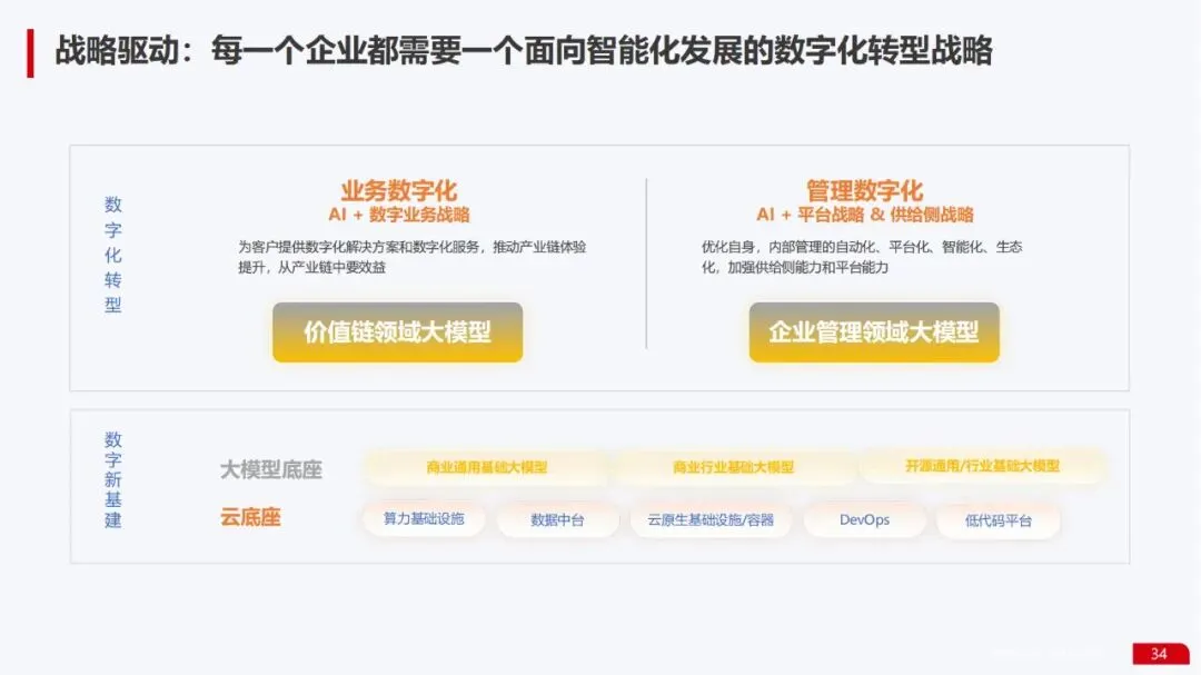 咨询规划能力:提出了“以点带面”的企业大模型实施方法论,强调需要面向智能化的数字化转型战略,并提供了从顶层技术链路设计到总体架构的完整蓝图。