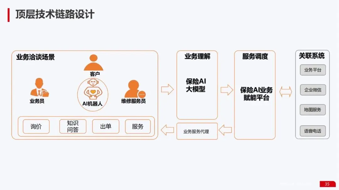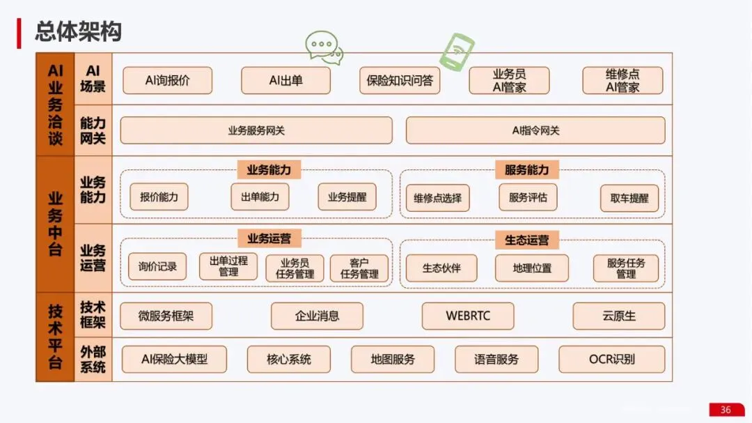 总体架构:展示了融合了能力中心、生态运营平台和第三方大模型的技术架构,确保方案的可扩展性和生态兼容性。其在“AI业务洽谈场景”中描绘的“机器人出单·客户服务”、“维修服务”、“业务员秘书”等蓝图,清晰地体现了业务与技术深度融合的思路。