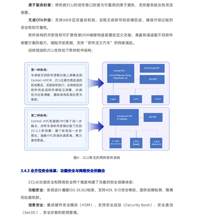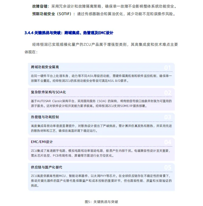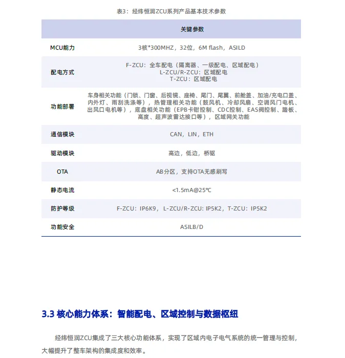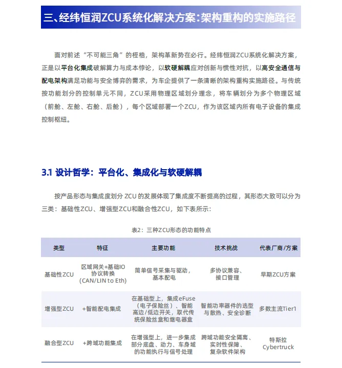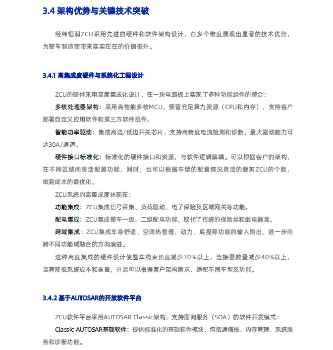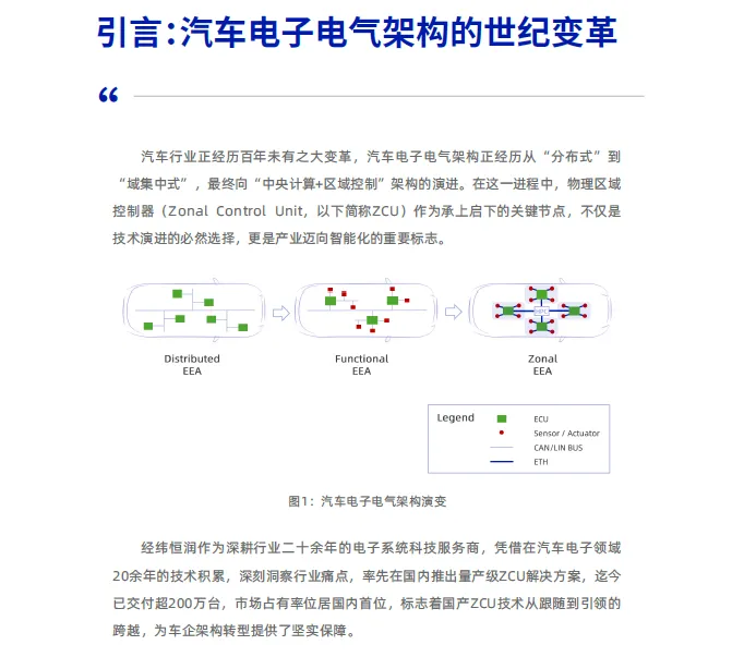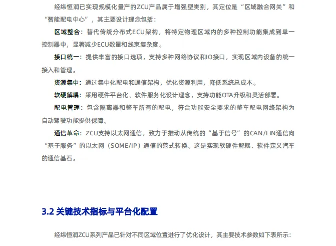 面对汽车产业向“软件定义汽车”转型过程中传统分布式架构的瓶颈,经纬恒润提出向“中央计算+区域控制”架构演进是破局关键。其ZCU产品以“区域融合网关”与“智能配电中心”为双重定位,通过高集成度硬件平台、基于AUTOSAR的开放软件架构及全方位安全体系,旨在为行业提供核心解决方案。