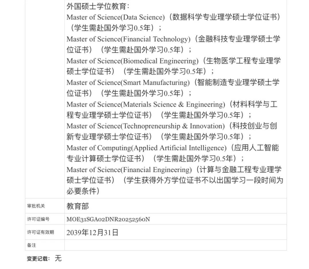 3. 本硕贯通,设计凸显灵活性项目规划总规模达5000人,覆盖本科与硕士层次。其中,硕士项目采用自主招生模式,首年计划招收2000人,为广大应届生及职场人士提供了宝贵的“计划外”升学通道。尤为值得注意的是,其1年制“0.5(国内)+0.5(新加坡)” 分段培养模式(计算与金融工程专业可全程国内),在保证海外沉浸式体验的同时,极大优化了时间与经济成本。