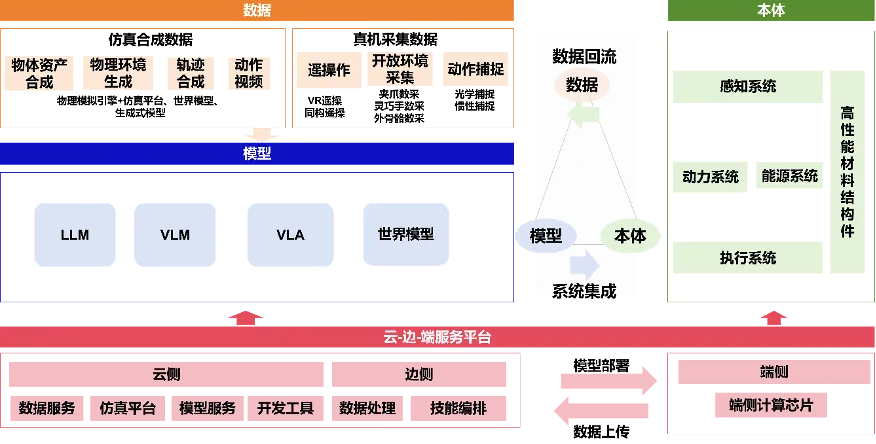 根据中国信息通信研究院(CAICT)的定义,具身智能技术框架正从早期的模块化AI算法集成,转向由大模型驱动的统一技术框架,在通用性和泛化性上取得突破。这一框架的核心是围绕“数据-模型-本体”三大关键技术要素,实现软硬件的深度融合创新。