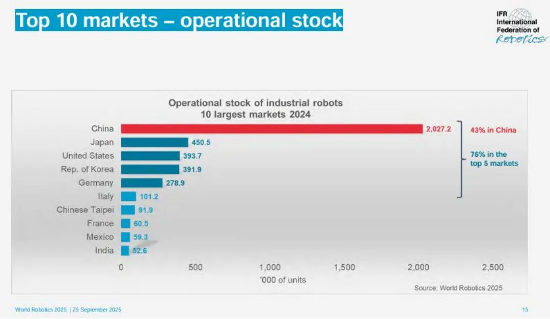 从全球机器人部署情况看,亚洲是绝对的主导力量,中国市场更是引擎中的引擎。根据国际机器人联合会(IFR)发布的《世界机器人报告 2025》,2024年全球工业机器人安装量中,亚洲占比高达75%,而中国市场的安装量达到29.5万台,占全球总量的54%,稳居世界第一。