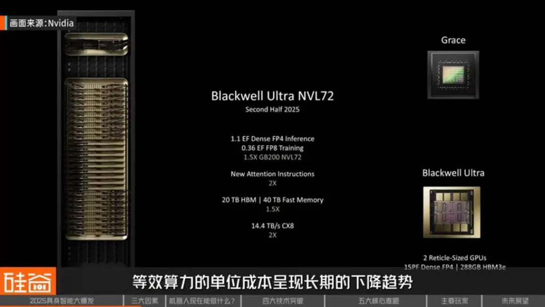 一方面,芯片厂商持续推出性能更强的GPU,使得等效算力的单位成本呈现长期下降趋势。以英伟达为例,随着新一代Blackwell Ultra架构芯片在2025年下半年推出,其FP4推理性能达到惊人的1.1 EF,是上一代的1.5倍,这将极大提升模型训练和推理的效率。