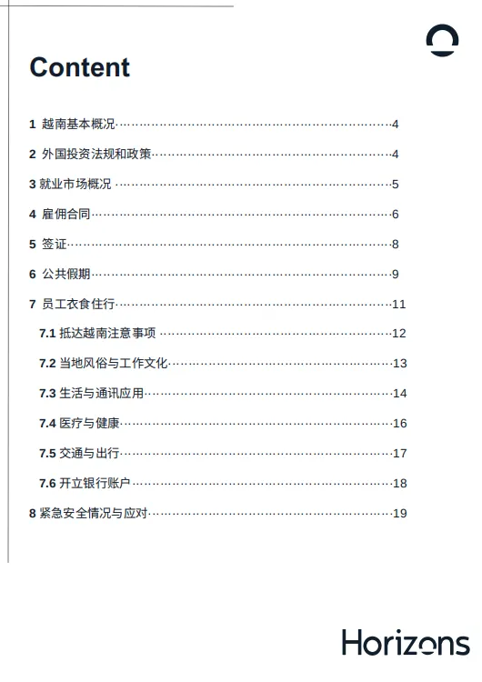 《Horizons越南出海白皮书》聚焦企业赴越发展核心需求,详解外资政策、雇佣合规、薪资福利等关键要点。越南实行外资负面清单制度,企业雇佣需签订越南语书面合同,明确社保缴纳、加班工资等细则,规避用工风险。