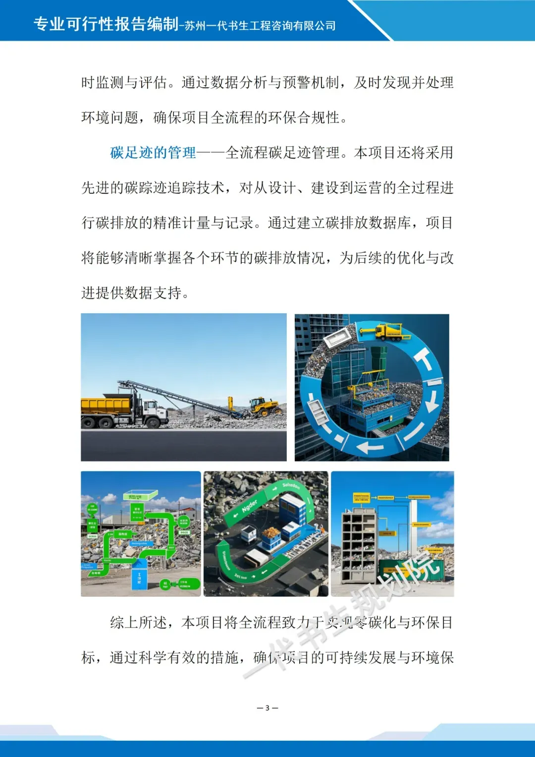 政策与市场角度:紧扣无废城市建设政策导向,明确项目合规性依据,分析区域建筑垃圾产生量、回收缺口及市场需求,预判项目盈利与社会效益契合点。 技术与工艺角度:阐述核心回收处置技术的成熟度、先进性,明确破碎、分拣、再利用等工艺流程,说明设备选型、环保达标措施,保障技术可行、能耗可控。 经济与风险角度:简要测算项目投资、成本及收益,明确投资回报周期;梳理政策、技术、市场潜在风险,提出针对性防控措施,论证项目经济合理性与抗风险能力。