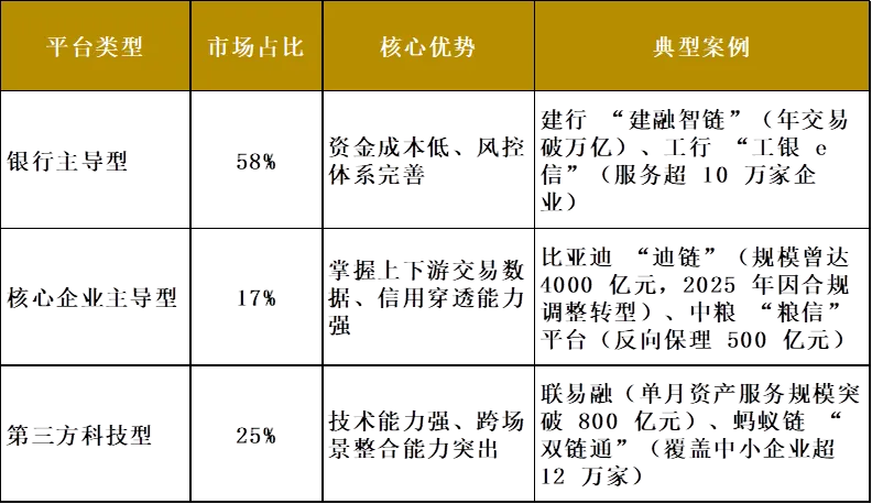 平台化模式已成为供应链金融的核心运营载体,2025 年通过数字化平台完成的交易占比超65% 。其核心分类与特征如下: