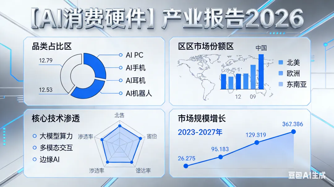 商业层面:2025年全球AI消费硬件市场规模突破8000亿美元,2026年预计同比增长35%,中国市场贡献超30%份额,成为全球核心增长极;消费群体呈现全龄化渗透特征,Z世代偏好智能交互型产品,中老年群体侧重健康监测类硬件,企业级市场对定制化AI硬件需求快速上升;核心赛道中,智能穿戴设备(健康监测、运动追踪)、智能家居中枢(多设备联动控制)、AI辅助驾驶终端成为增长主力,头部企业通过“硬件+算法+服务”生态整合提升用户粘性;市场竞争呈现“头部集中+细分突围”格局,国际品牌凭借技术积累占据高端市场,本土企业依托供应链优势和场景创新在中低端市场快速扩张,但同质化竞争与价格战现象突出。