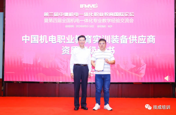 论坛期间进行了“中国机电职业教育供应商资质等级评定”活动,深圳市技成科技有限公司获得了第一张“中国机电职业教育实训装备供应商资质等级证书”。