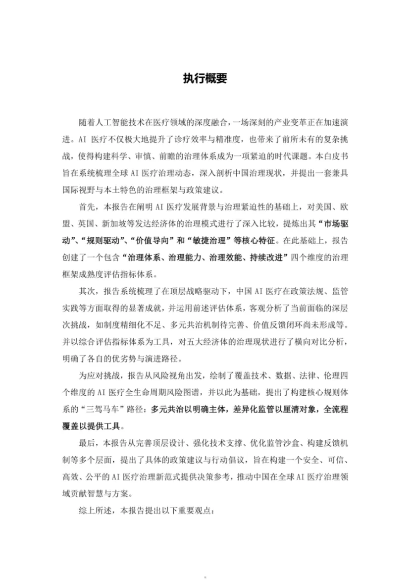 人工智能技术与医疗领域深度融合,AI 医疗在提升诊疗效率与精准度的同时,也催生了复杂治理挑战,构建科学前瞻的治理体系成为紧迫课题。本白皮书系统梳理全球 AI 医疗治理动态,剖析中国治理现状,致力于打造兼具国际视野与本土特色的治理框架。书中深入对比美国、欧盟、英国、新加坡等发达经济体的治理模式,提炼核心特征并构建包含治理体系、能力、效能、持续改进的评估指标体系。聚焦中国 AI 医疗治理,展现顶层战略驱动下的政策法规建设与实践成就,客观分析制度精细化不足等深层挑战。白皮书绘制了技术、数据、法律、伦理四维度全生命周期风险图谱,提出多元共治、差异化监管、全流程覆盖的核心规则体系,从政府、企业、医疗机构等多主体出发,给出具体政策建议与行动倡议,为构建安全可信、高效公平的 AI 医疗治理新范式提供决策参考。