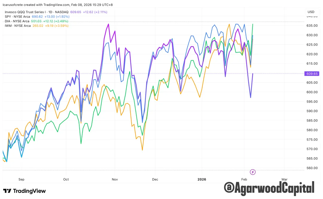 本周美股的核心特征是「指数层面分化」与「风格轮动加速」:道指强,纳指弱,标普接近平盘,小盘股相对抗跌。周中经历了连续下挫,周五出现强力反弹修复,但并未改变“老经济与防御偏强,高成长与软件偏弱”的结构。