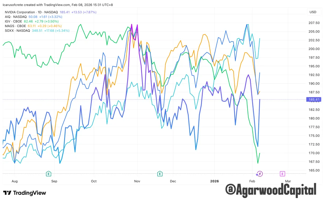 圖二:NVIDIA/AIQ/IGV/MAGS/SOXX 走勢對比圖