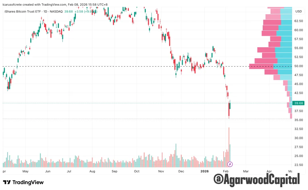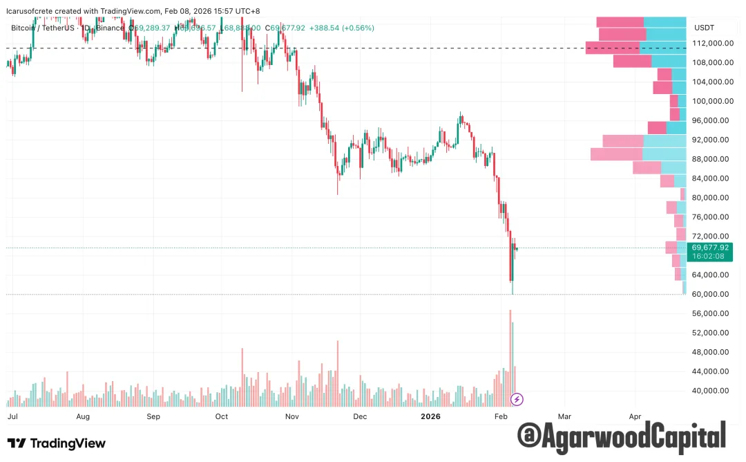我們認為60K是短期底部了,未來一兩個月會有個震盪反彈的過程,有可能測試78K-83K區域,原因是市場出現了巨量的投降式拋售和換手,遠超之前80K那輪,不論場內,還是ETF(IBIT),再配合著市場上有一些機構被清算的消息。