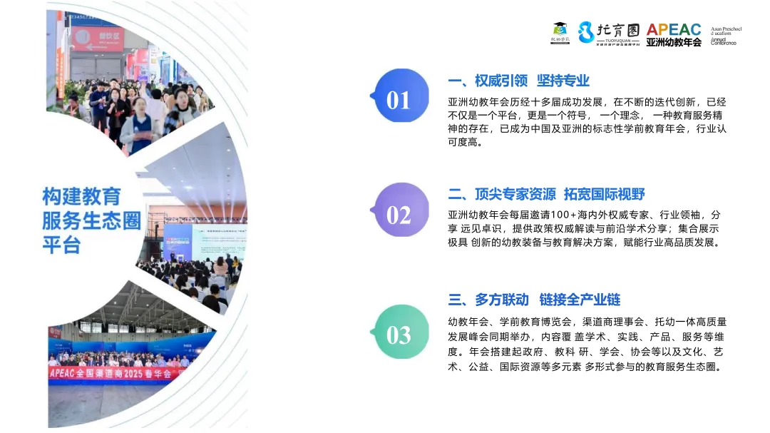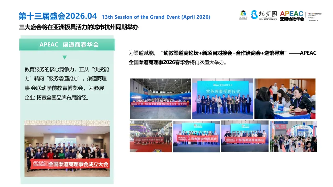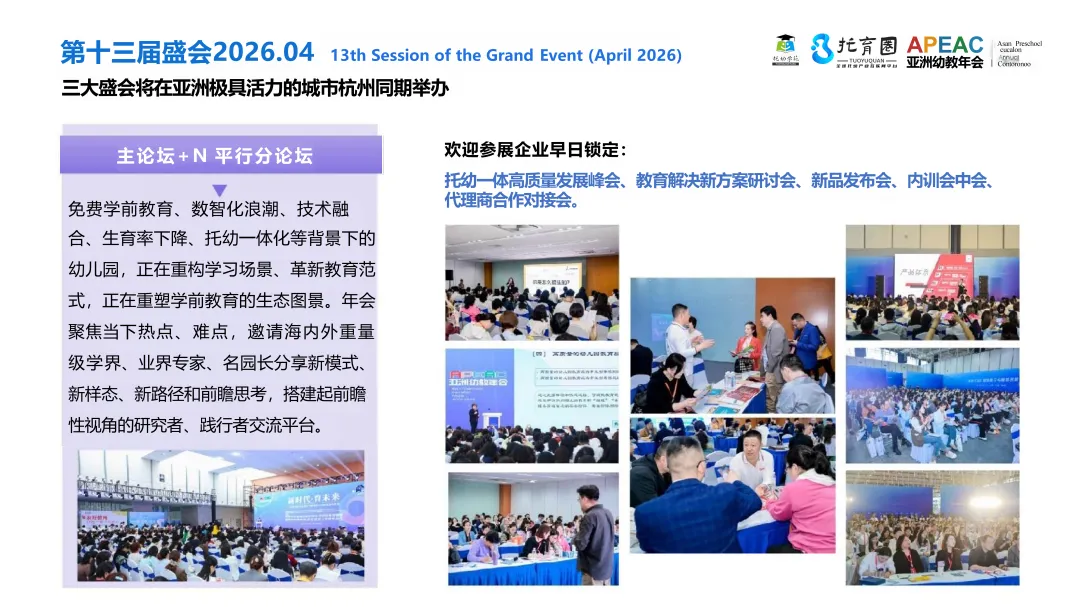 2026年度盛会即将开启,2026年4月10-12日,第十三届亚洲幼教年会&APEAC教育博览会相约杭州,“十五五”最新政策趋势解读+托幼一体高质量发展峰会+园所转型破局实践探索+创新特色示范园参访+托幼渠道商论坛+新项目对接会+合作洽商会+巡馆寻宝+线上线下联动分享交流,展位预定,论坛分享,项目推广,示范园参访、参会学习全面开启,欢迎大家一起来约