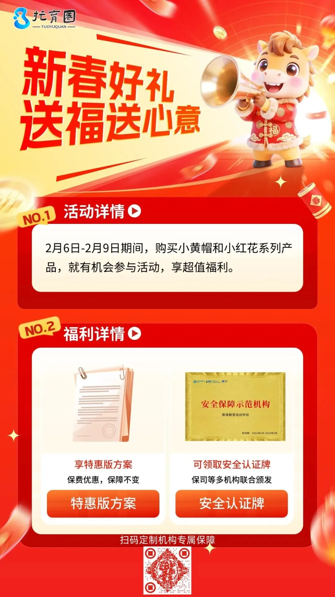 【园所必备】安全保障到位,园所经营无忧,不仅能保障托幼机构、孩子和家长的权益,降低机构经营风险还能提升家长的满意度,建立良好的家校关系,托育圈粉丝会员新春投保享特别优惠,赠送安全认证铜牌,马上申请!