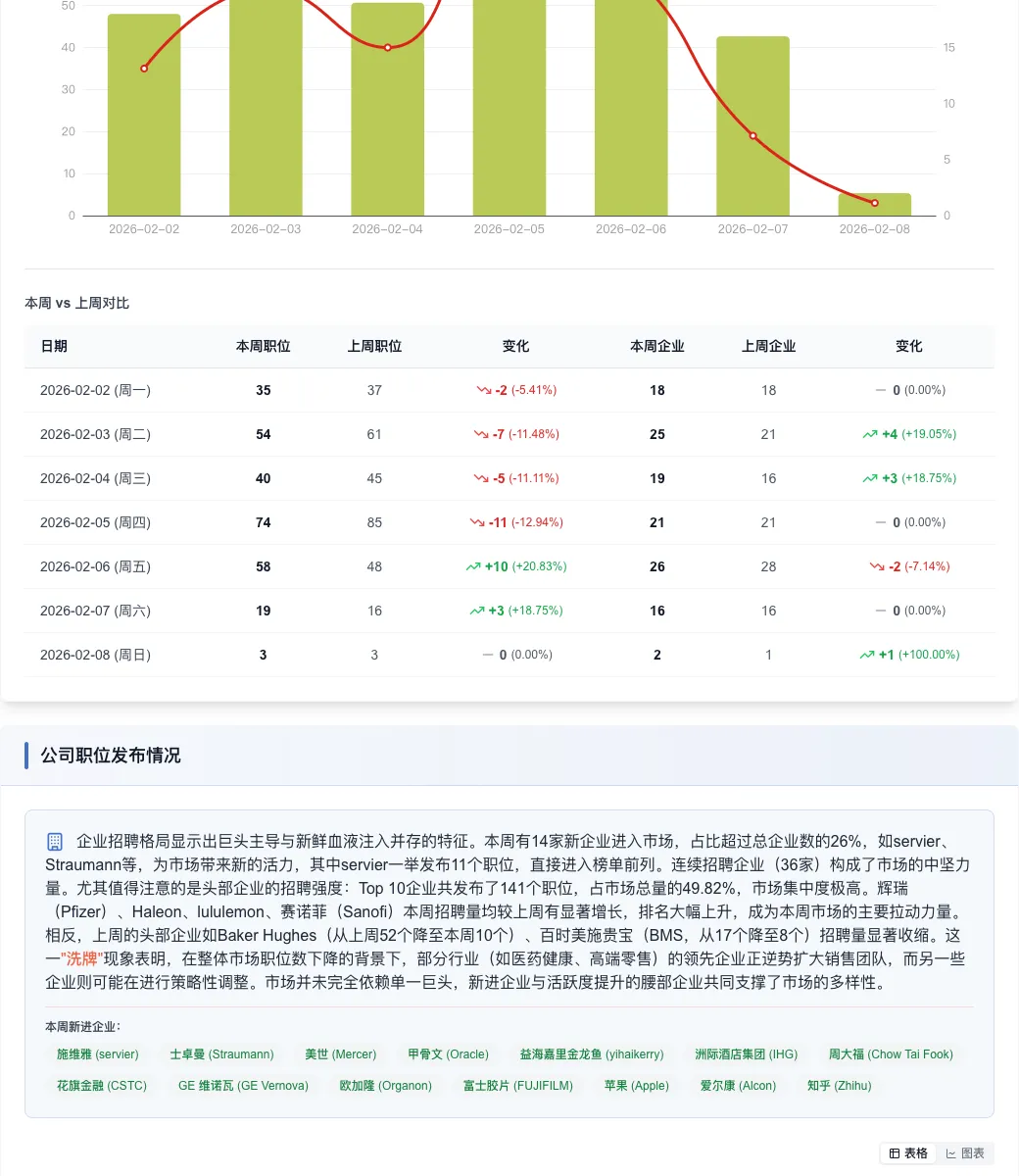 虽然宏观数据呈现温和回调,但细节中隐藏着市场的韧性。周动态显示,职位发布呈现明显的**“前低后高、周末骤降”**特征。周四、周五(2月5-6日)合计贡献了132个职位,形成了一个显著的小高峰。这种“错峰发力”暗示企业在节后人力资源规划上更为审慎,更倾向于在周中完成内部审批后集中释放高质量岗位,而非盲目投放。