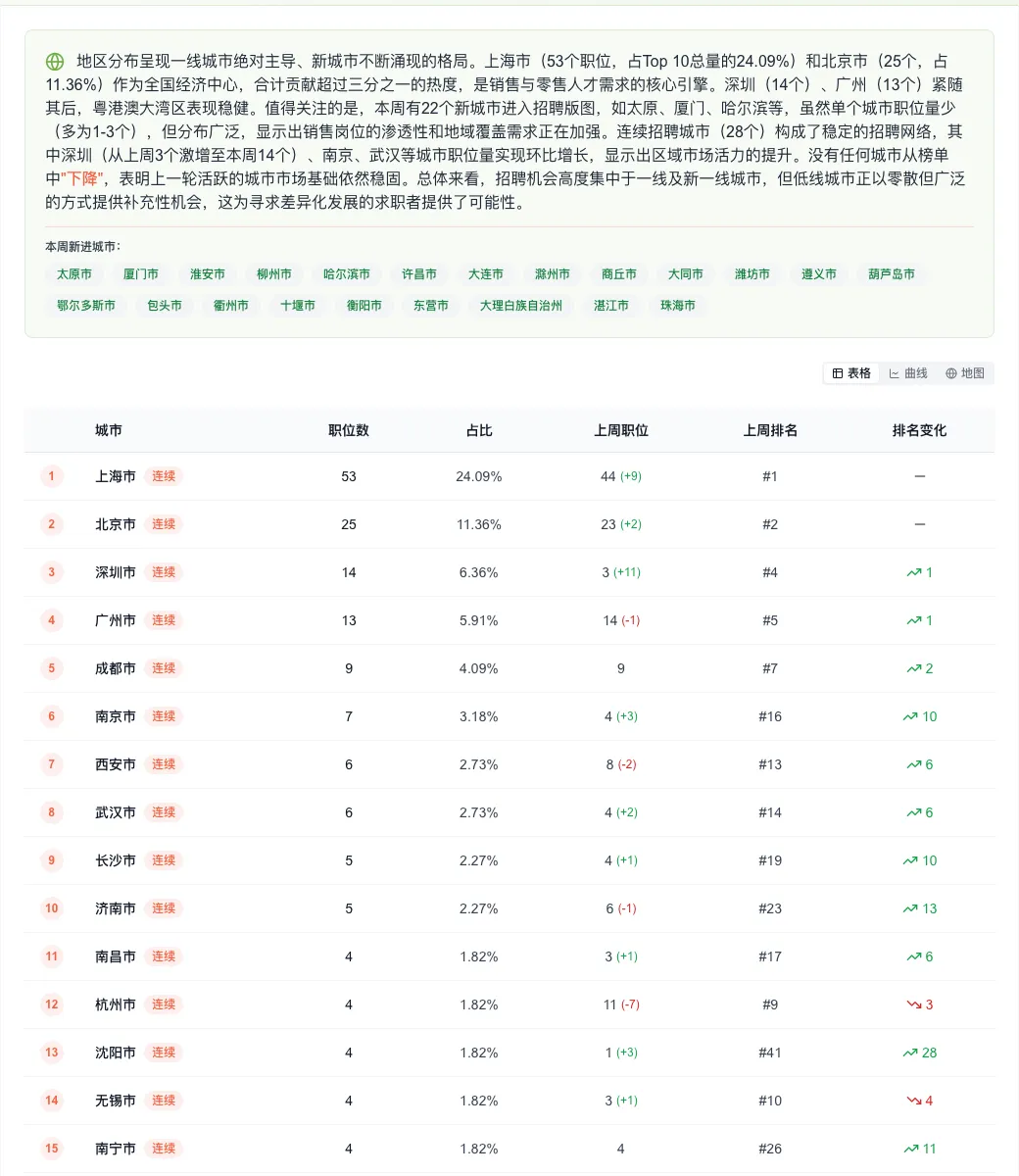 上海(24.09%)与北京(11.36%)合计占据了超过三分之一的市场热度。深圳本周表现强劲,环比增加11个职位,展现出大湾区的回暖势头。 - 新城市的广域渗透: