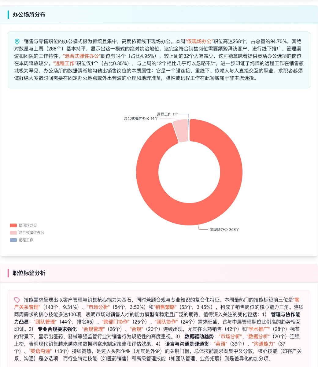 94.7%的职位要求“仅现场办公”,远程办公占比不足0.4%。这再次印证了销售职场“依赖深度交互”的本质属性。 - 技能画像: