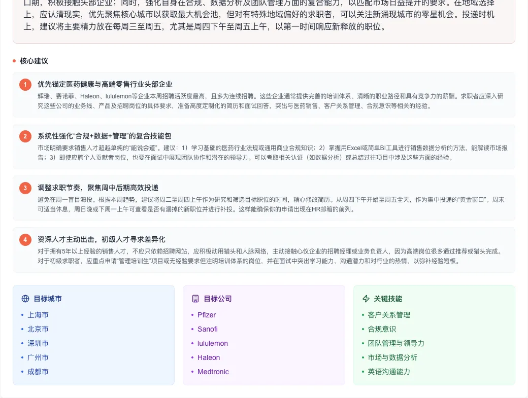 强化“合规+数据+管理”的复合能力。在简历中不仅要体现销售额,更要体现市场分析方法论和合规管理案例。 - 优化投递节奏:
