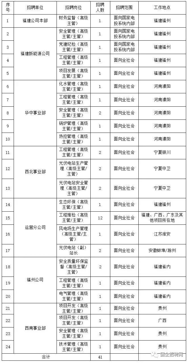 国家电投集团福建新能源有限公司(简称“福建新能源公司”)成立于2016年6月,主要负责风电、光伏、综合智慧能源等项目开发、建设、并购,投资项目分布于福建、江西、安徽、山东、河南、宁夏、贵州、内蒙古等地。目前,前期、核准、在建、投运以及并购的项目装机容量超100万千瓦。根据工作需要现公开招聘相关人员,具体事项公告如下: