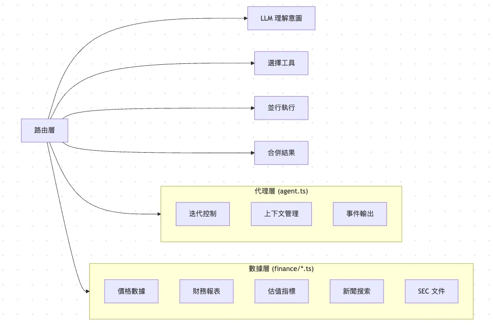 // 路由層工作流程func: async (input) => {// 1. 用 LLM 理解用戶意圖const { response } = await callLlm(input.query, {tools: ALL_FINANCE_TOOLS, // 綁定所有金融工具});// 2. 提取工具調用const toolCalls = response.tool_calls;// 3. 並行執行(多個工具可以同時跑)const results = await Promise.all(toolCalls.map(tc => FINANCE_TOOL_MAP.get(tc.name).invoke(tc.args)));// 4. 合併結果return combineResults(results);}