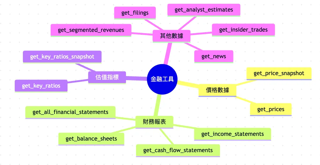 Dexter 最大的價值在於它集成了豐富的金融數據工具。這些工具都是對 Financial Datasets API 的封裝,讓 AI 能夠像分析師一樣查數據。