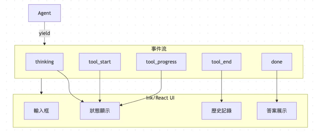 // Hook 訂閱代理事件const handleEvent = (event) => {switch (event.type) {case 'thinking':setWorkingState({ status: 'thinking' });break;case 'tool_start':setWorkingState({ status: 'tool', toolName: event.tool });break;case 'tool_progress':updateProgress(event.message); // 實時更新進度break;case 'done':setAnswer(event.answer);break;}};// 代理流式輸出事件forawait (constevent of agent.run(query)) {handleEvent(event);}