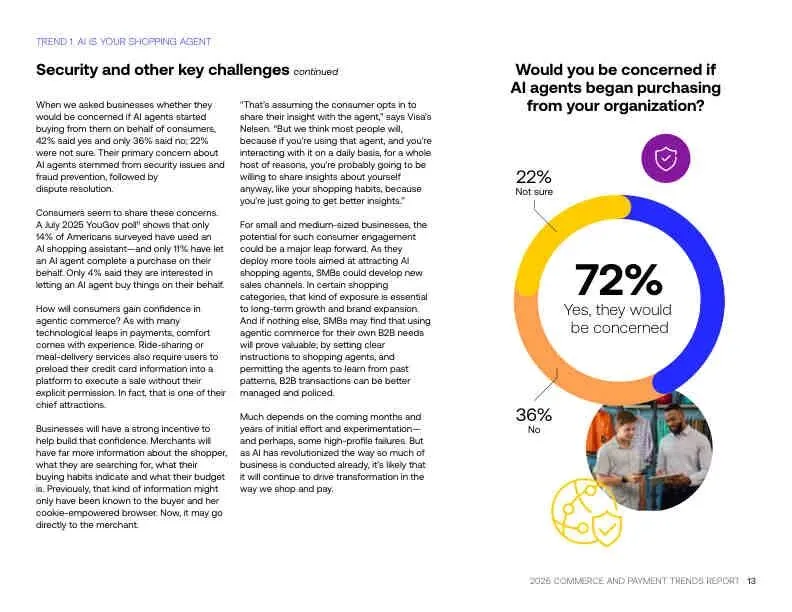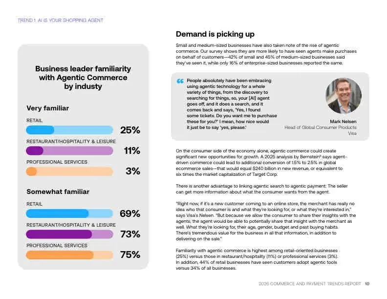 - 小企业更早接触:42%-45%的小/中型企业已遇到AI代理购物,远高于大企业(16%)。