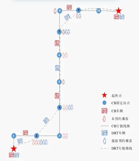 需求响应公交是定制公交的一种运营服务模式,是指在一定服务区域内,不设定固定运行线路和时刻表,根据服务区域内的乘客预订需求,灵活制订运营方案,乘客在指定停靠站点上下车的服务模式。