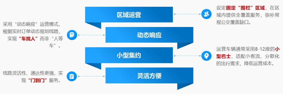 需求响应公交核心特征可概括为“区域运营、动态响应、小型集约、灵活方便”,具体如下: