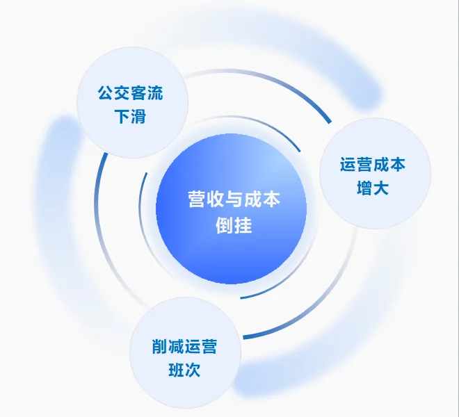 随着机动车保有量激增、共享出行方式普及,传统公交无法满足个性化出行需求,城市公交企业营收与成本倒挂加剧,陷入“客流下滑—运营成本压力增大—削减运营班次—客流再下滑”的恶性循环。