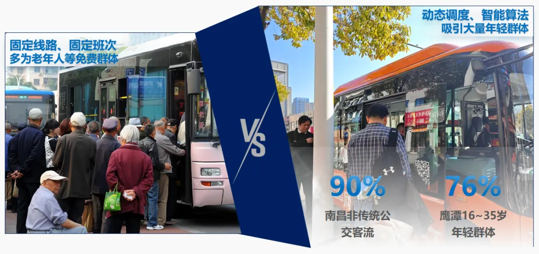 针对传统公交“固定线路、固定班次”的服务瓶颈,通过动态调度、智能算法,将用户需求与出行路线精准匹配,吸引大量年轻群体回归公交客流。南昌吸引了90%的非传统公交客流,鹰潭需求响应公交订单量16~35岁的年轻群体占比高达76%。