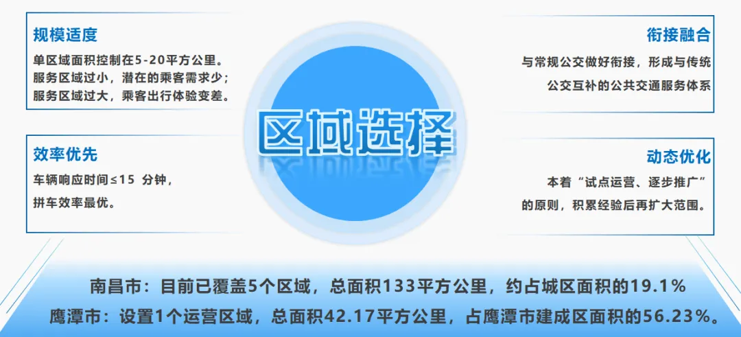 对于规模较大的城市,建议先选择1-2个核心场景(如高校片区、高铁片区、政务片区、商圈片区等)试点,本着“试点运营、逐步推广”的原则,积累经验后再扩大范围。如南昌市选择先从城市边缘的九龙湖片区、东站片区等区域试点开通,逐步向城市中心红谷滩区域拓展,目前已覆盖5个区域,总面积133平方公里,约占城区面积的19.1%。