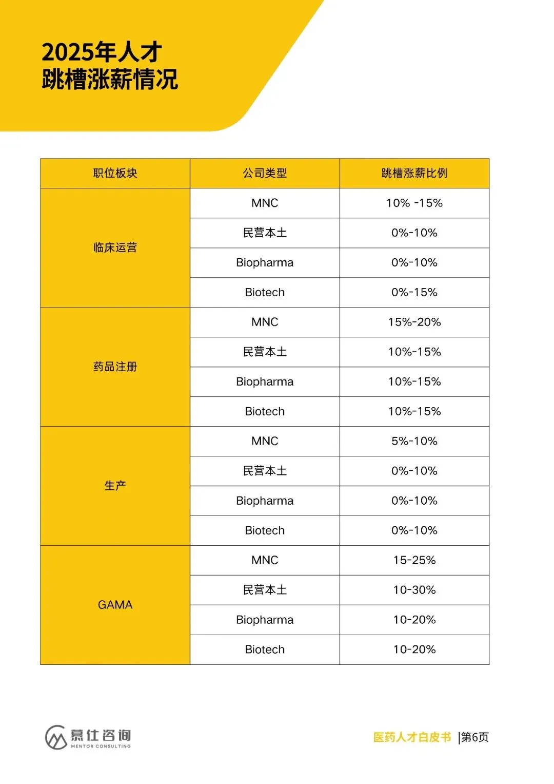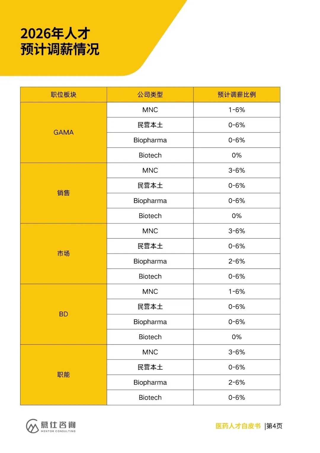 慕仕咨询基于43家医药公司调研,发布2026年医药人才招聘与薪酬白皮书,解析行业人才生态。2026年调薪呈差异化:MNC领先(2%-8%),Biopharma与民营本土持平(0%-6%),Biotech保守(0-6%占82%)。2025年跳槽涨薪主流为10%-15%,MNC稳定,民营高端人才竞争力强,Biopharma/Biotech两极分化,前端岗涨幅高于后端。