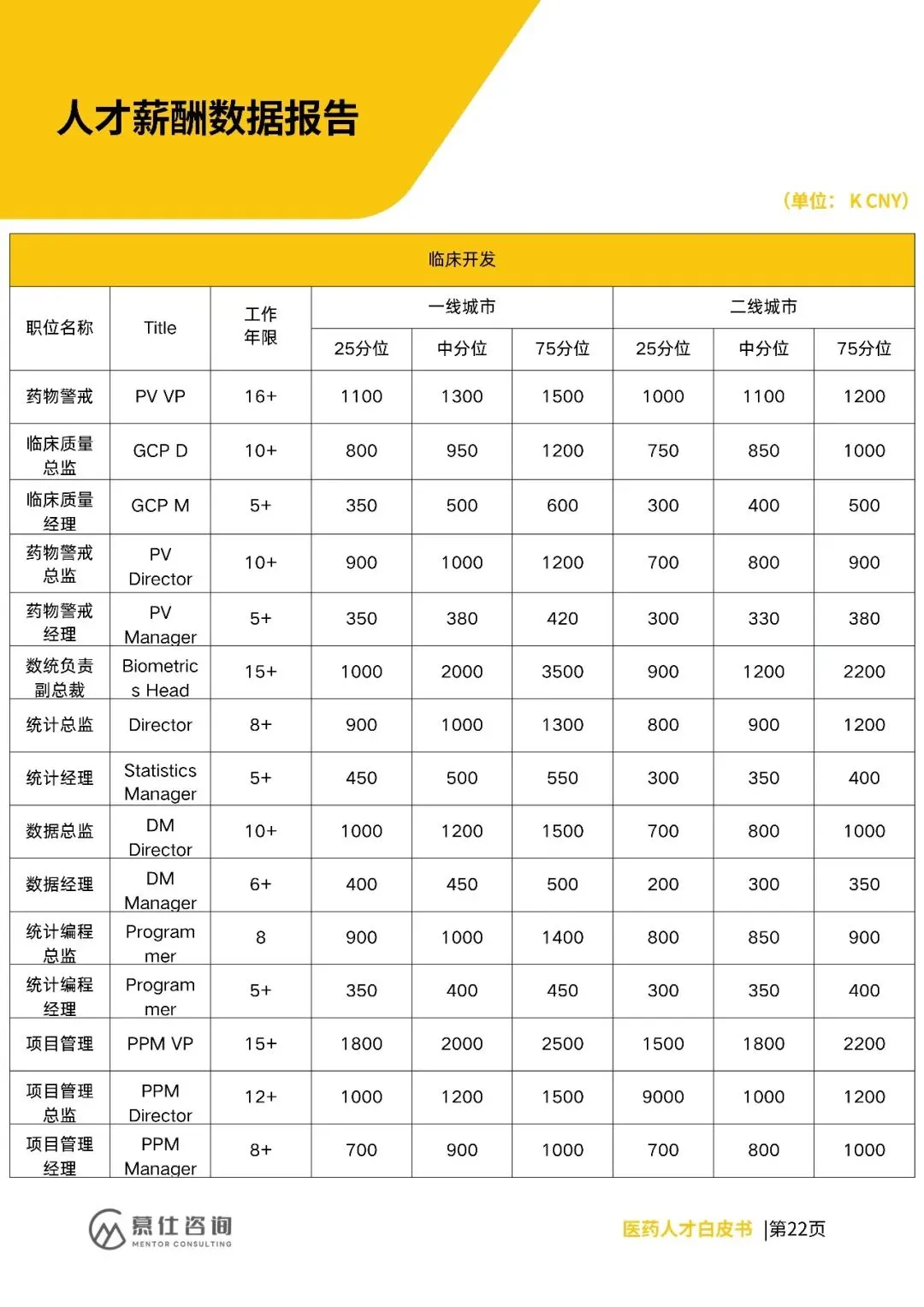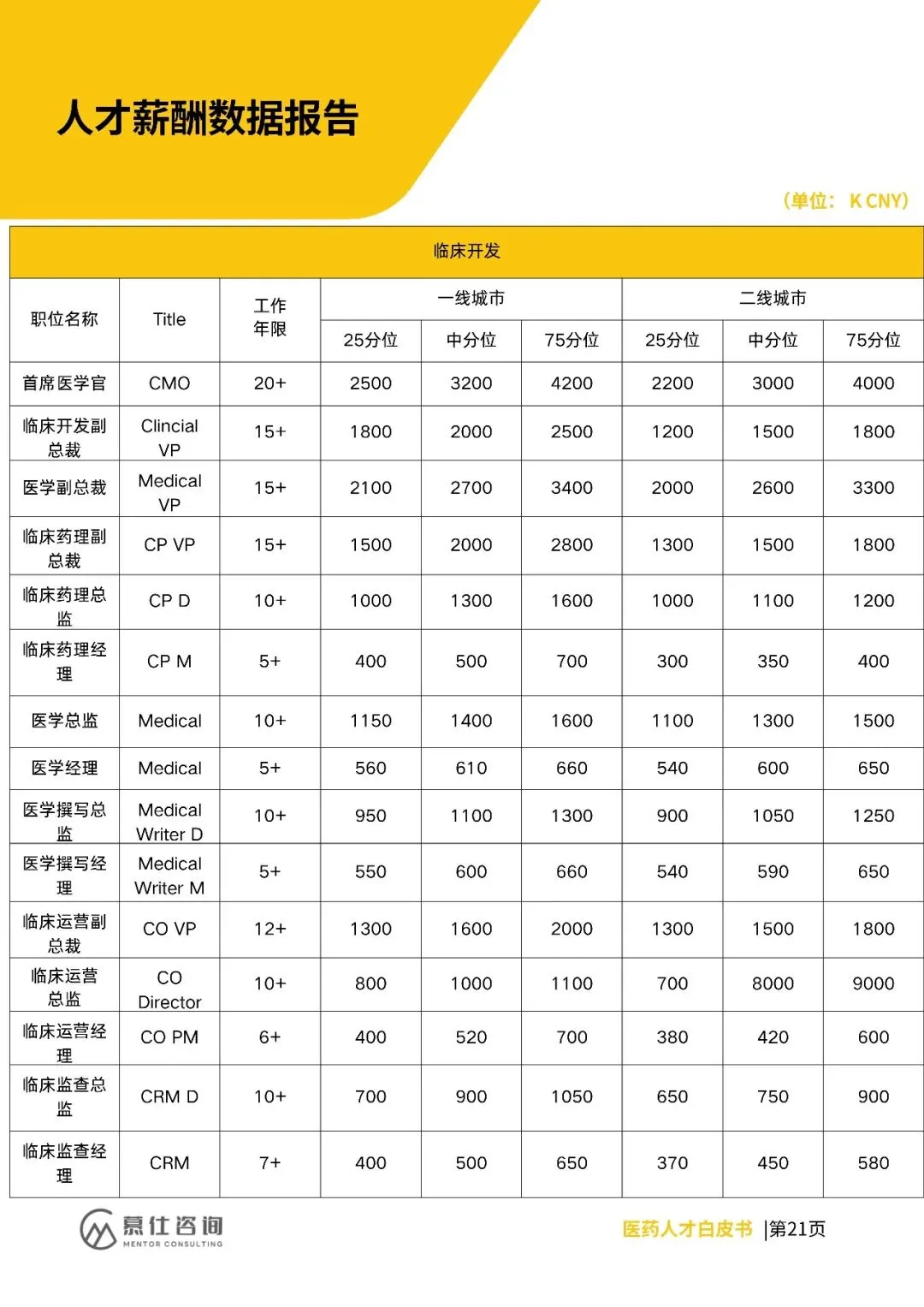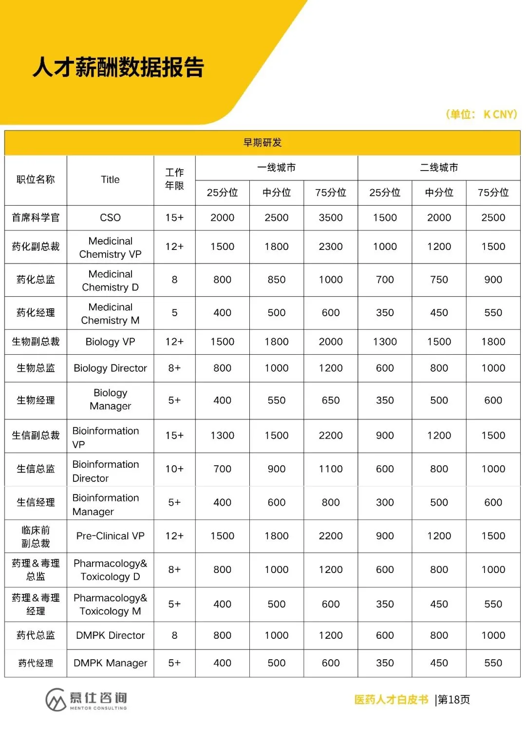 招聘上,早研、CMC、临床等核心领域需求向创新载体集中,复合型人才(如AI临床、国际监管)紧缺,企业重项目真实性与长期绑定。薪酬方面,各岗位分位值明确,高端岗(如CSO、CMO)一线城市中分位达2500K、3200K,二线城市略低。