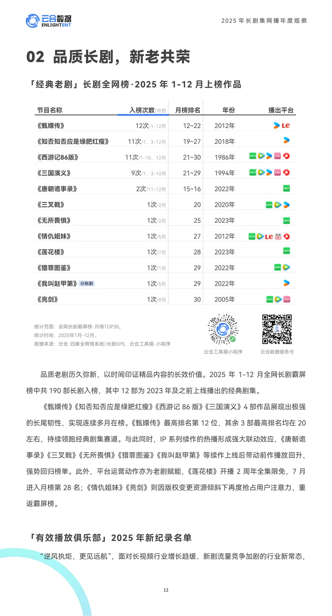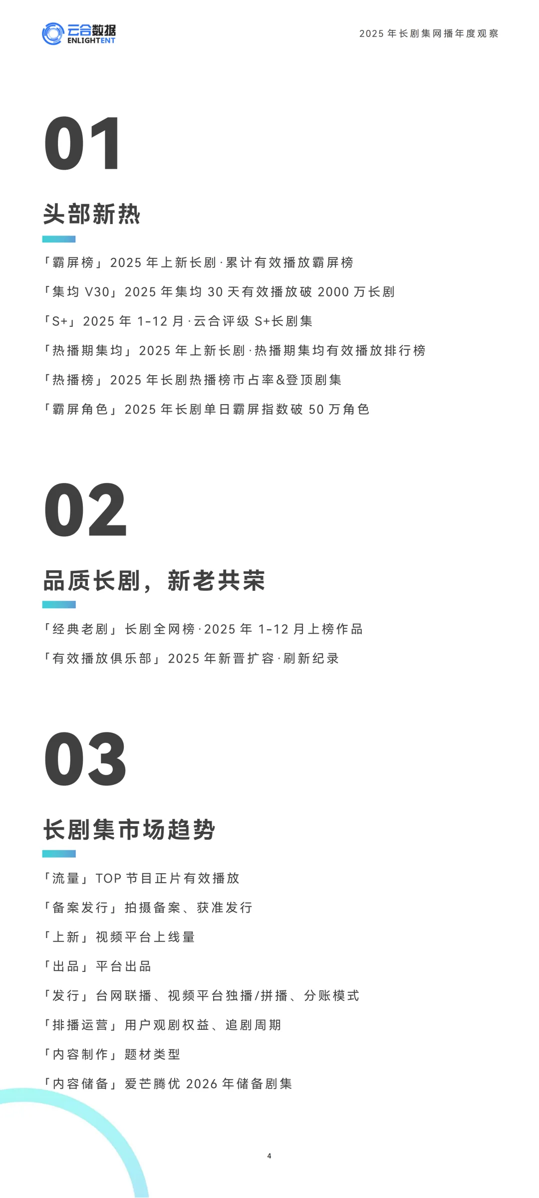 2025年长剧集市场深陷深度调整,用户注意力被短剧等多元内容分流,头部剧集流量明显收缩,但行业已摆脱单纯流量内卷,内容价值实现强势回归。全年上新长剧规模趋于平稳,题材布局聚焦核心赛道,运营效率持续提升,独播模式成为主流;进入2026年,四大平台剧集储备充足,布局重点向现实题材、历史正剧倾斜,叠加创新排播与ToC分账模式,行业正朝着良性、理性的方向转型,悬疑赛道的叙事创新、IP续作的长效开发也成为当下市场热门亮点。