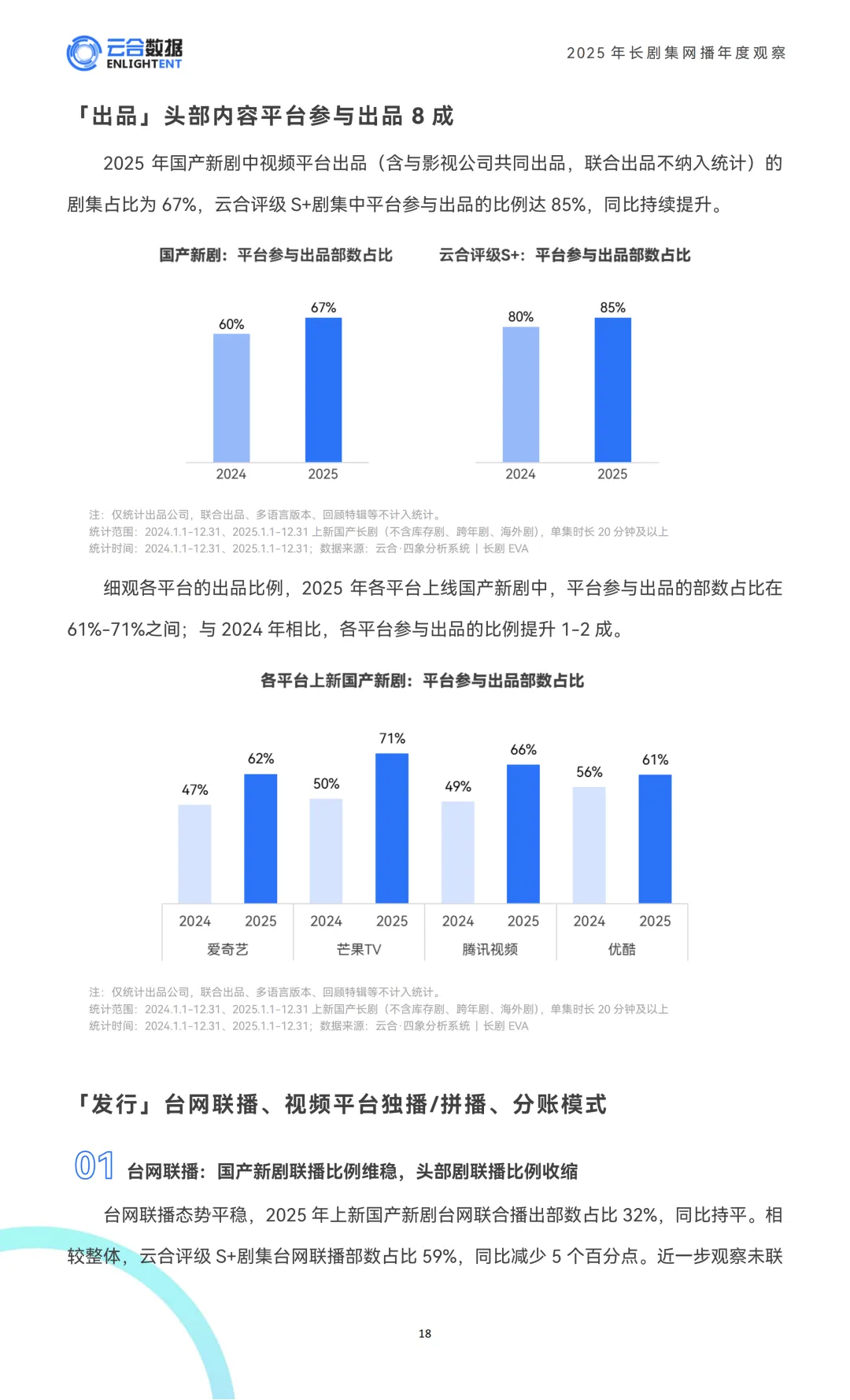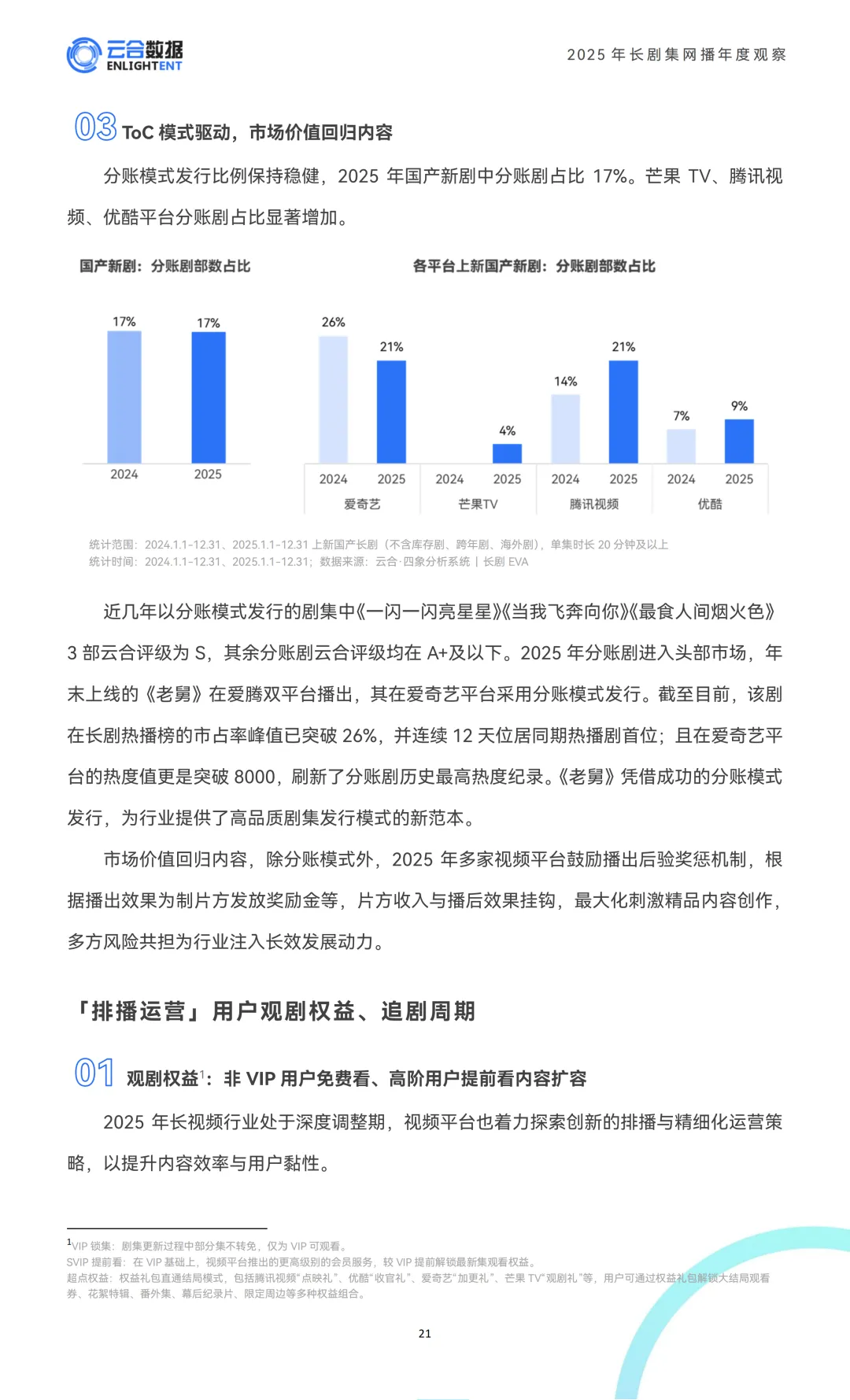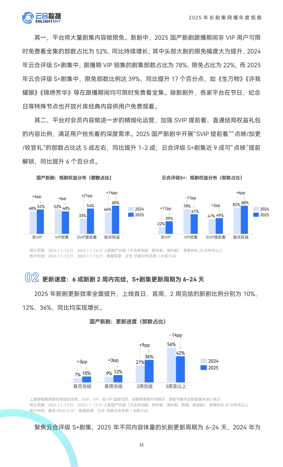 2025年的S+剧集,题材上很有倾向性,古偶占了近四成,现偶和古今悬疑涉案是核心赛道,像现偶爆款《许我耀眼》、古装悬疑剧《藏海传》,还有当代涉案剧《以法之名》,都是当年S+剧集的代表作。排播上也很灵活,接近四成的S+剧跟播期间会限时免费看全集,88%支持付费直通结局,会员运营做得更精细了。更新节奏也明显加快,平均更新周期15.6天,比上一年缩短了1天,尤其是40集的长剧,更新效率提升特别明显。另外平台对头部内容的掌控力也更强,85%的S+剧集有平台参与出品,独播占比更是达到88%。