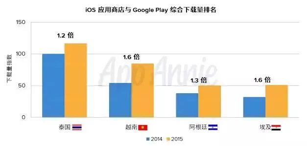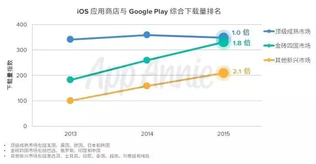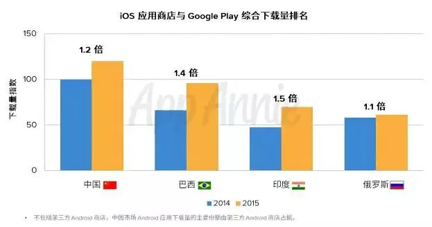巴西、俄罗斯、印度和中国(金砖四国)堪称推动下载量持续增长的功臣。这一趋势在2015年仍未减退,上述四大市场的iOS和GooglePlay综合下载量同比增长近80%。