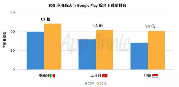 墨西哥的市场规模相对较大,与此同时,土耳其和印尼也在2015年取得了飞速进步。土耳其的应用市场由智能手机的迅速普及以及消费者对于数字内容需求支撑。印尼以高增长型移动市场的身份崛起后,导致技术投资者与硬件制造商热情高涨,应用下载量约有40%的增长。