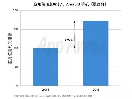 墨西哥与美国的独特关系,有助于这个市场借助出口增长充分利用美元优势,从而促进就业。由于就业增加,消费支出上涨,应用的下载量、收入和参与度(尤其是Android设备与GooglePlay)全都随之攀升。来自UsageIntelligence的数据显示,设备持有量的激增加上应用用户参与度的提升,导致墨西哥2014年至2015年的应用使用总时长增加了75%。
