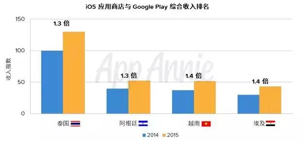 同时,智能手机普及率的迅速提高、基础设施的改善以及用户群的壮大,也让墨西哥、印尼和土耳其成为众多应用发行商在过去一年的必争之地。随着应用经济持续发展和竞争加剧,2016年发行商很可能需要挖掘更多机遇。AppAnnie认为在全球市场中,泰国、越南、阿根廷和埃及最值得期待。