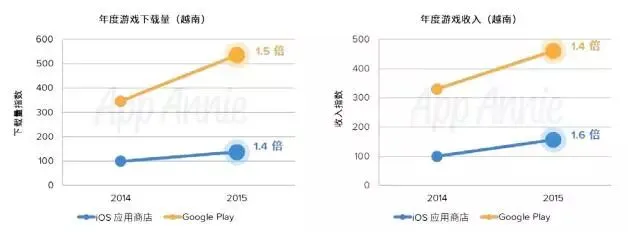 大多数新兴市场中,游戏下载量与收入通常都是应用经济繁荣的风向标,而2015年越南的游戏市场表现备受瞩目。现在,手游已经成为越南文化生活中的重要组成部分,在2015年GooglePlay和iOS两个平台下载量都占据了近50%的份额。随着这两个平台游戏收入的加速增长,应用盈利前景也值得期待。
