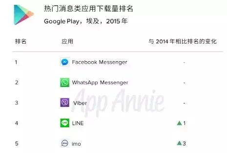 除工具类别外,消息类别仍是埃及应用市场的重要组成部分。大多数市场的金字塔顶都是由少量消息类应用掌控,埃及的竞争格局却相对开放,前12名中有5款消息类应用。2FacebookMessenger和WhatsAppMessenger一路领先,但Viber在阿拉伯国家地区有很大的影响力,在埃及市场中也仍是名列前茅。一直在新兴市场中表现不俗的LINE也参与了角逐。最后,imo以其在2015年内实现的超常增幅同样入围热门竞争者名单。多款消息类应用的激增,很可能是埃及移动市场尚处于早期成长阶段的表现。随着未来一两年的深入发展,谁将成为最终胜者将更加清晰。