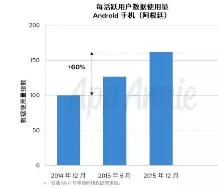 巴西与墨西哥的庞大用户群可确保其在拉美移动应用市场上的统治地位,另一方面,智能手机也开始在阿根廷迅速风靡,而且智能手机普及率已超越其邻国巴西。此外,面向运营商的UsageIntelligence数据显示,从2014年12月至2015年12月,随着电信基础设施以及移动网络的改善,消费者也从中受益,阿根廷的每活跃用户数据使用量实现了60%的增长。鉴于智能手机用户使用的数据流量越来越多,在巴西和墨西哥两头猛虎之侧的阿根廷,同样也值得我们关注。