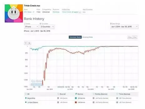 从阿根廷移动行业发展中获利的不只是国外应用发行商。本地发行商Etermax一开始在为TriviaCrack造势时遇到了困难,但经过几项功能调整后,该应用一跃成为阿根廷2014年榜单的游戏类冠军,成功一直持续到2015年。Etermax并不想陶醉于荣耀的光环中止步不前,而是以这一成功为跳板向国际市场进军,并在包括美国在内的16个市场中拔得头筹。