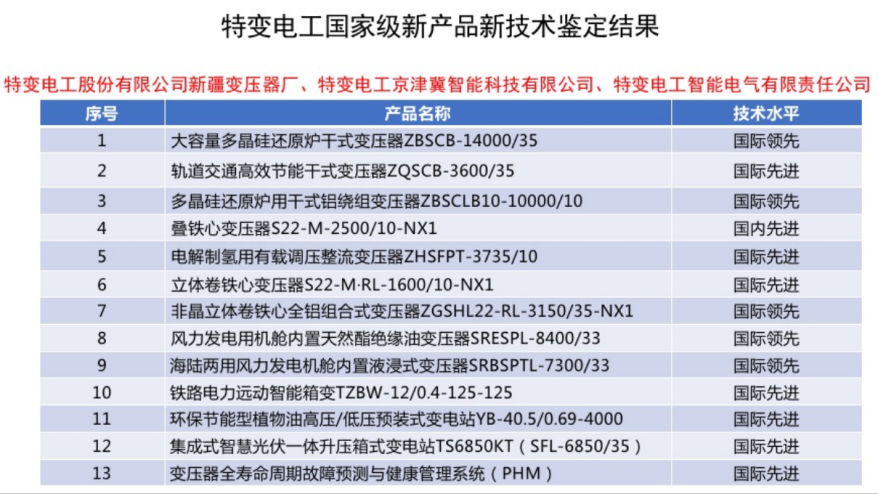 近日,中国机械工业联合会在天津市武清区召开“绿色智慧能源装备技术论坛暨新产品鉴定会”,期间由特变电工股份有限公司新疆变压器厂、特变电工京津冀智能科技有限公司联合研发的“SRESPL-8400/33风力发电用机舱内置天然酯绝缘油变压器”等13项新产品技术,一次性通过国家级鉴定,其中5项技术产品达到国际领先水平,7项达到国际先进水平。