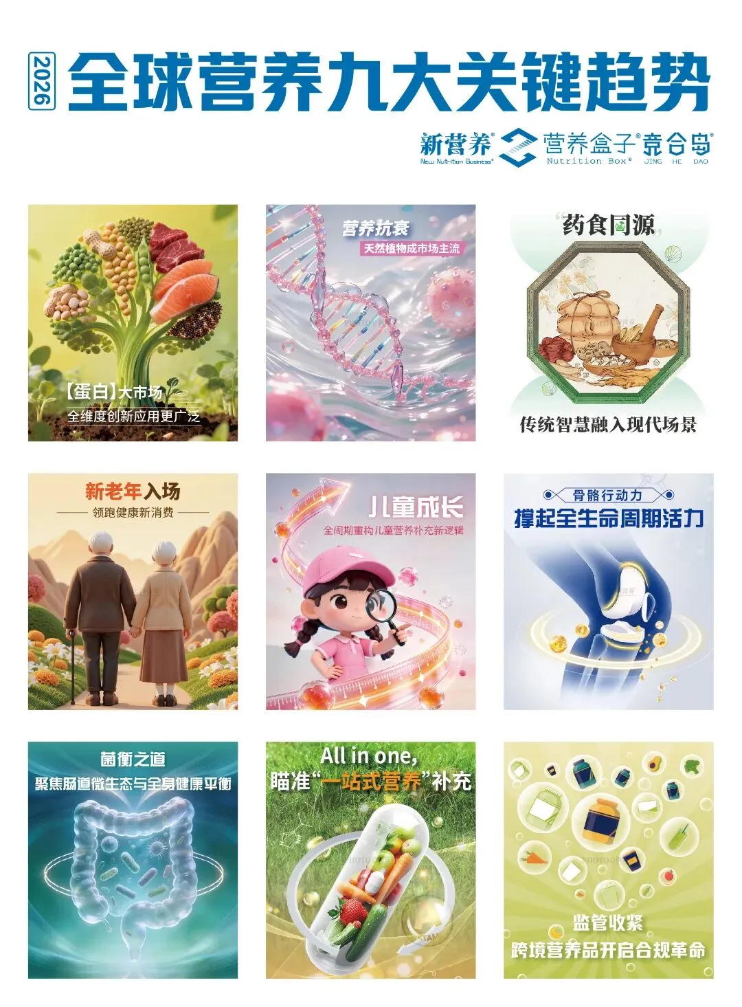 时序更替,2026 年的健康消费市场正迎来全新变革。在政策红利持续释放、消费需求精准升级与产业链创新迭代的三重驱动下,营养健康产业告别同质化竞争的粗放时代,迈入以细分需求为核心、以科学合规为底线的高质量发展新阶段。值此行业转型关键期,新营养重磅发布2026全球营养九大关键趋势,从蛋白创新到抗衰革命,从银发经济到儿童营养,全方位勾勒行业发展蓝图,为市场参与者提供清晰的前行指引。